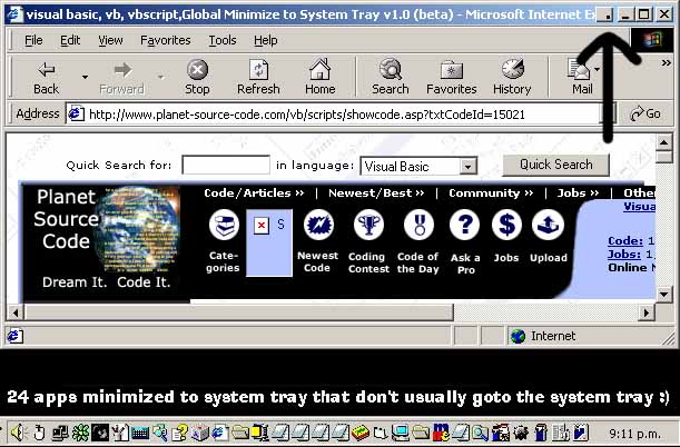is a VERY cool app. It adds a button to the windows default buttons for forms (X, Max/Restore, Minimize) for Minimize to System Tray. This is a fully working version tested in WinNT (2K) and Win98. Please comment on any bugs Apart from: 'Some windows stay on task bar' - I'm fixing that at the moment.. (note, you can send upto 999 apps to the system tray.. I wouldn't try it though..)