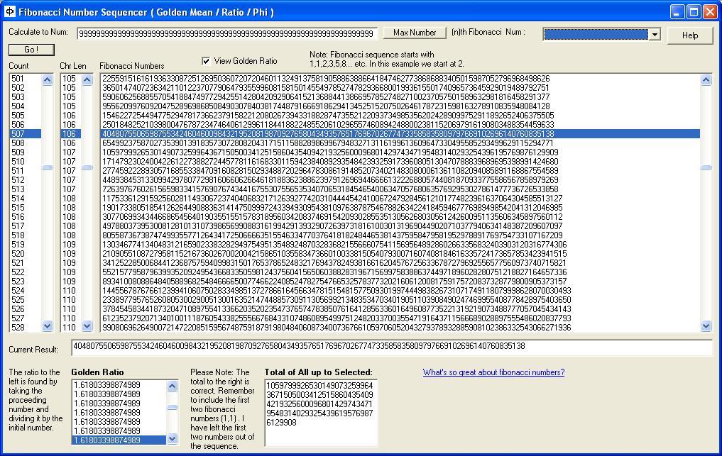 This program will sequence up to the 1,476th Fibonacci number (309 digits long). These super long numbers avoid exponent display ( E+ num ) and rather spell out the value. It shows the Golden Ratio for each number and explains in the code exactly how to come up with it. The Golden Ratio is an extremely interesting number as it appears in many things in nature such as pinecones, seashells, body parts, dna, reproduction of bees, hurricanes, birth of universes and much more! The mysterious number Phi has been found in many ancient architectures and even in paintings by Leonardo Da Vinci. The numbers were also used to create beautiful musical compositions. This is definitely something worth exploring.