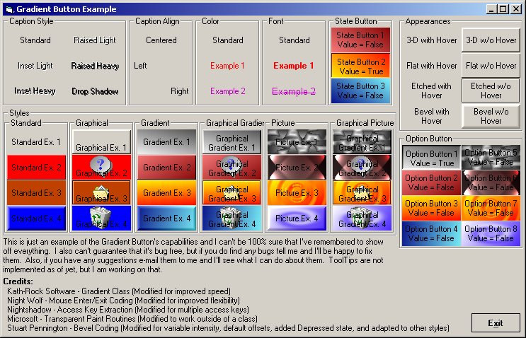 This button was created to be an enhanced replacement for Visual Basic's standard command button by adding 2 more Border appearance schemes, 2 more button styles, hover effects, 5 more caption styles, and state button compatibility. I cannot guarantee that this code is bug free although I have made every attempt to make it such. If you have any problems with this code please contact me and I'll do what I can to help you though the problem.