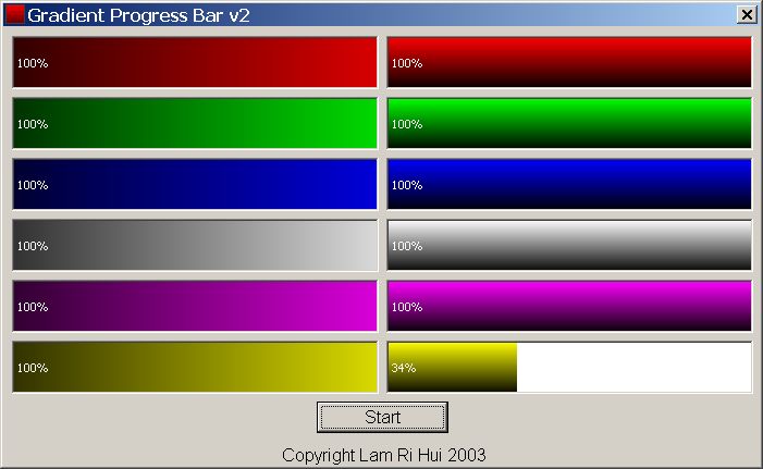 Gradient Progress Bar v2 is the second version in its series. This progress bar now comes with 12 types of gradient in two main categories: horizontal gradient and vertical gradient. They are 6 colors in each category. Comments are welcomed. If you liked this progress bar, please vote.