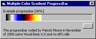 Welp, I saw all the progressbar posts so I thought I'd code my own :] The Gradient ProgressBar OCX (ActiveX control) is very similar to the Progress Bar control that is bundled with VB. However, it replaces that boring Blue default color with a custom gradient! You can pick any two colors! The ZIP includes the OCX, its source code, and an example project demonstrating how to use the OCX. Both projects are completely commented. Check out the screen shot, and please take the time to vote if you find this useful :)