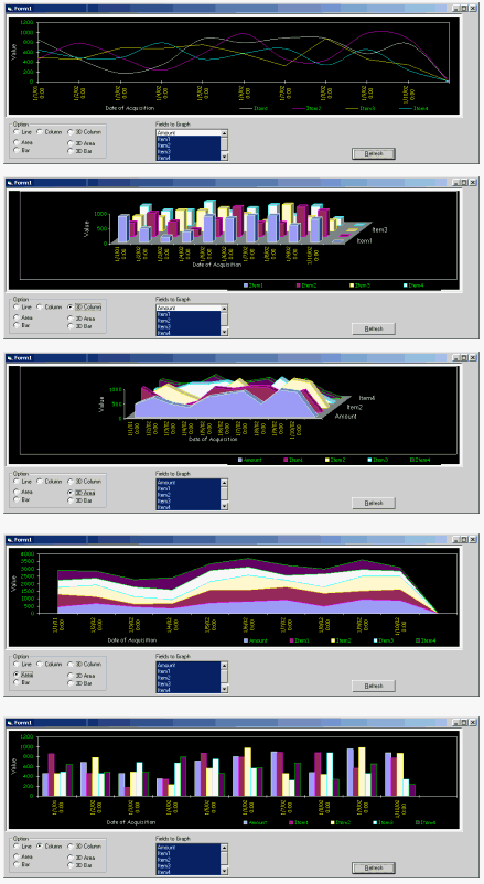 GRAPH! **IMPROVED** This shows the power of the Function to create graph. You can now Maximize/Restore Graph with out distorting the picture. Printing is now available too. It can Dynamically regenerate itself with the change of select statement. This will show you how to make graph either Smooth Line, Bar, Area, Column, 3D Column, 3D Line, 3D Area... etc. I find it so nice, the graph function is so short, you'll love it... please leave some comments and your vote if you like it!!!