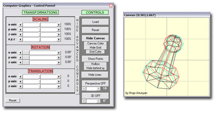 This program is a complete 3D graphics engine. Excellent Learning Tool. It allows you to define your own 3D shapes in text files and load them. Once the shapes are loaded you may use transformations such as scaling, rotations and translation. There is a 3D view mode that shows an anaglyph of the shape. There is also perspective mode and much much more. Please Vote and ENJOY!!
