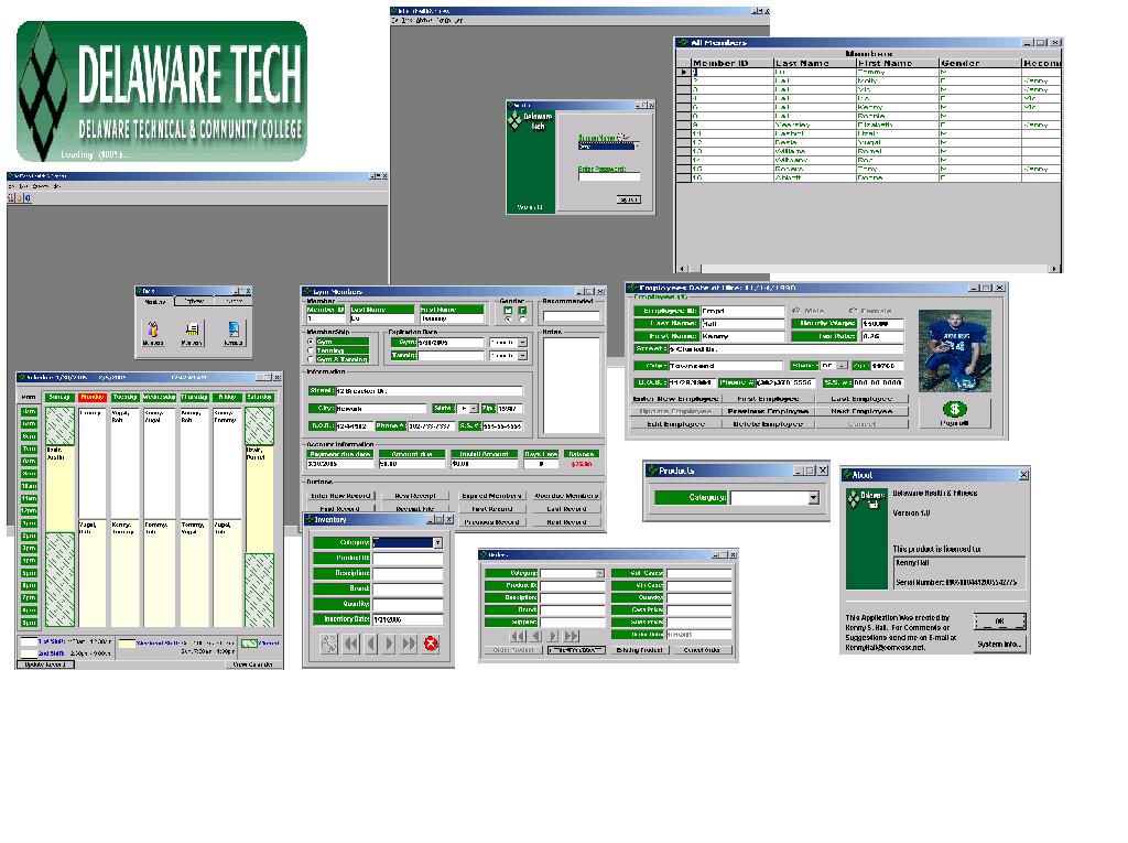 This is a gym application that I created for my VB class. This App. keeps track of members, employees and inventory. This program uses MS Access with SQL DAO.