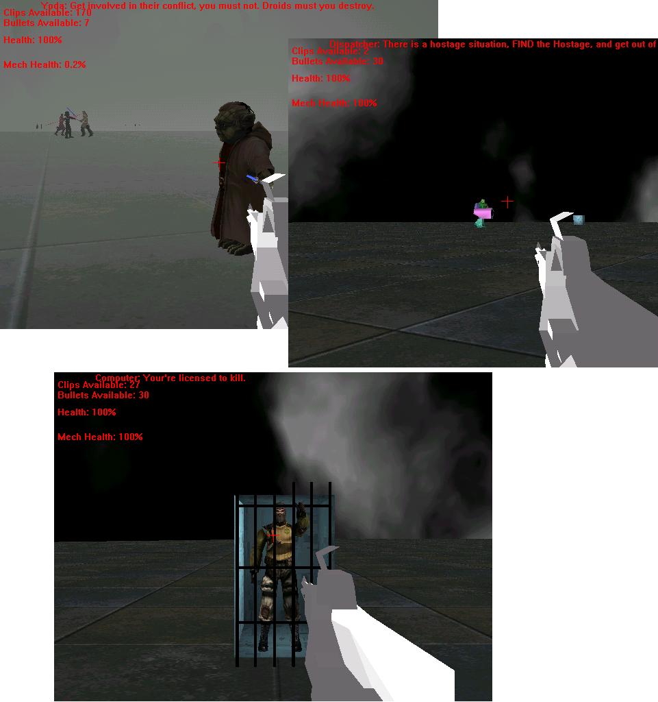 Complete first person shooter, with sound, and full animated models. You're a soldier sent into an area to free a hostage but encounter a hostage?! What!? Exactly. With four jedi knights and yoda?! Check it out. All animation are done by me except for gun and cyborg, thier credits are in the main module's declaration. Any code taken is credited in the declarations of the main module. Remeber to vote, especially since i'm a gr.10 student ;)This game is extremly fast and heavely commented. It also includes an executable as fps.exf, just change the .exf to .exe ;) Note the textures for the battle are located at: https://vbcoders.com/vb/scripts/ShowCode.asp?txtCodeId=54256&lngWId=1 For some reason vbcoders.com won't let me upload the entire thing with textures and source code, the file probably got too big :D
