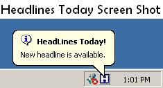 HeadLines Today sits in the system tray and pops up a Ballon tooltip every time it finds a News Headline from India & around the world. Clicking on the System tray icon displays the headline in the Titlebar. It keeps you updated of whats happening around the world while you are working on your PC.