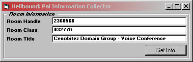 I put this cleaner version of the code to find the paltalk room window and to get some info about it, when i started programming for paltalk this was the hardest part of it, coz the title changes every time!, This code will find Red Room (non voice) and Blue Rooms (Voice) and works weather admin or not! Hope this is helpfull :) Comments Please