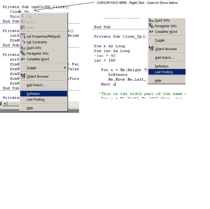 Did you know that (in the code) you can right-mouse click over a particular procedure, function, word, method, event, any declared variable, etc... Then choosing "DEFINITION" from the menu selection will jump you to where it was declared or the code for it?! See screen shot for example of this.