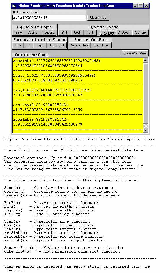 Uses the decimal data type to compute values of some advanced math functions with up 26-28 digits precision.