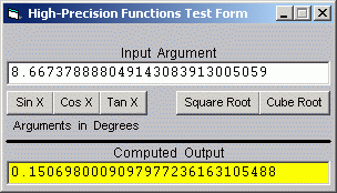 Computes high precision sines, cosines, tangents, square roots and cube roots.