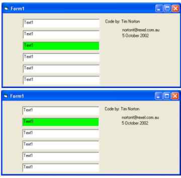 Highlight the active control in a different colour to draw attention. Does not require the gotfocus, lost focus for each control.
