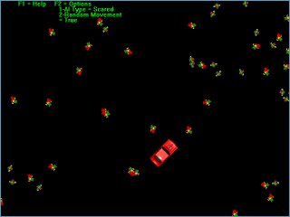 This was written a long time ago and I can see a lot of it is poorly written and set out and is totally uncommented, but if you can't understand something email me and ask:). Hit'n run is a full screen car game where there are pedestrians walking around and u get to run them over, it has no goal but it's a fun little game. There are some shortcuts I took like I used circular collision, which is fine for the pedestrians but for the car it means the pedestrians have to hit a circle that has a diameter of the width of the car. If you stay still and make AI "Suicidal" then move after a couple of dead pedestrians, their bodies will be in a circle not a rectangle like the car. Also the car has only one speed and a poor turning circle, the wide turning circle makes it a bit harder to hit the pedestrians, and makes it harder for anyone to notice the circular collision. The pedestrians AI is "None", "Suicidal" or "Scared", they speak for them selves. There is one extra option that effects the AI options above, that is random. If random is turned on it will effect the AI by turning the person randomly within 90 degrees of the direction set by the AI. I stole the picture of the car of GTA if you haven't already noticed.