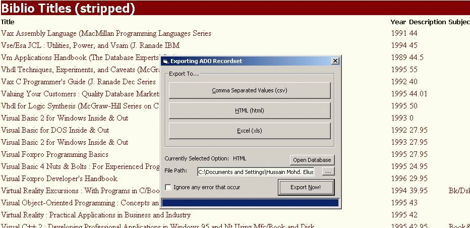 [Updated 27/2/05] Make your recordset universal! Use this class to export ADO recordsets into the industrial standered [csv], commercial standered [html] and the power user standered [Excel]. This is an updated version of my previous work, now complete Events, Properties, Documentation and even more options! Fuly optimized and commented. All bugs fixed. A must have for any database devoloper and a must add to any code library!