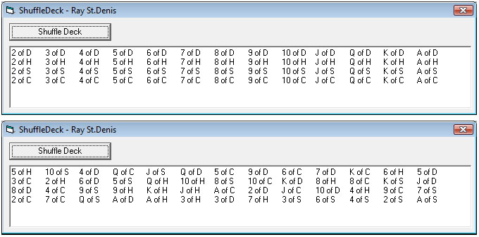 This example is to show how to shuffle a deck of cards using an extremely fast algorithm that does not have to check if a card has already been chosen. What this means is that the code is very fast making it very scalable as well. Although the example uses a deck of cards, it could just as easily be used to shuffle any series of objects with thousands of items.