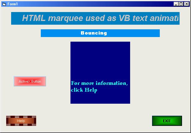 This code is an activex control button and text animation. I use HTML button and marquee. I use HTML button because in HTML you can make many kinds of good looking button very easy, combine with my knowledge in VB I intergate the two. At first I thought it was impossible but I did it.