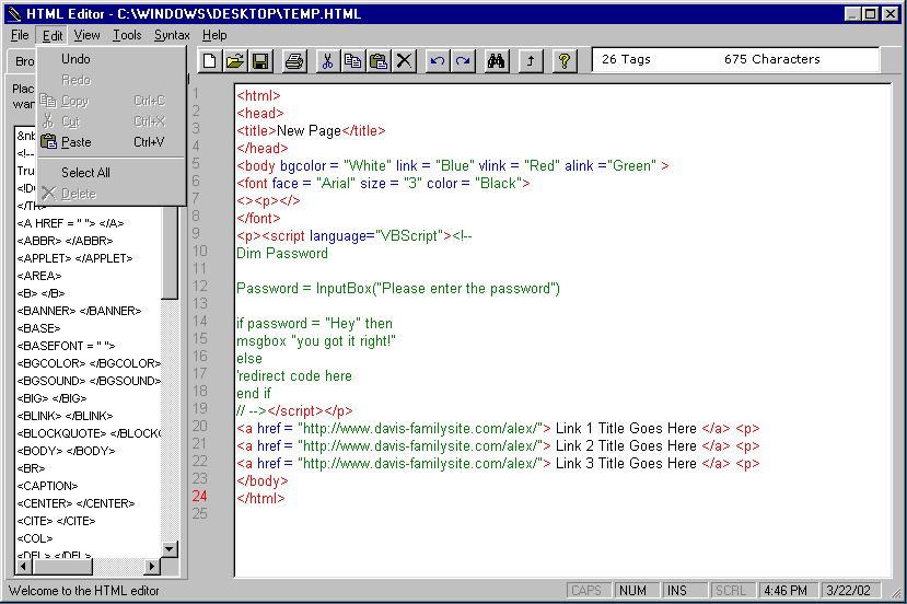 A small HTML Editor i've been working on for some time, let me know what you guys think. has Syntaxing, a file browser and generates a bunch of the html for you as well, comes with a simple viewer to view your page. Please give me feedback on how to fix bugs. thanks guys adn enjoy