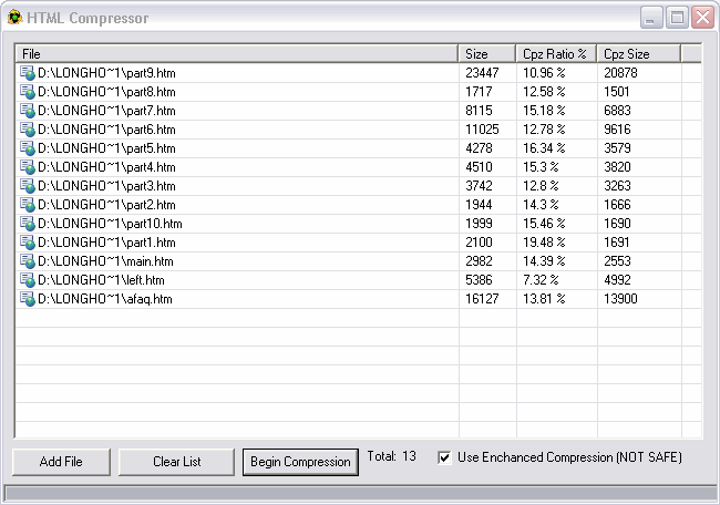 Compress your HTML files and reduce download time. HTML compression tool reduces the size of your HTML file almost upto 50%. When you build a html file there are lots of useless bytes which comsumes space. HTML compression tool removes those extra bytes,doing this will tightly compact your HTML code. You can also note the percentage ratio of the compressed file. This tool uses ENHANCED COMPRESSION- by enabling this feature you can eliminate all the extra tags which are not necessary. COmpress multiple files at once,this utility is extremely fast and free. It uses easy to understand code and also comes with a sample HTML file. I've seen many people selling it for $$$. So please vote for me.