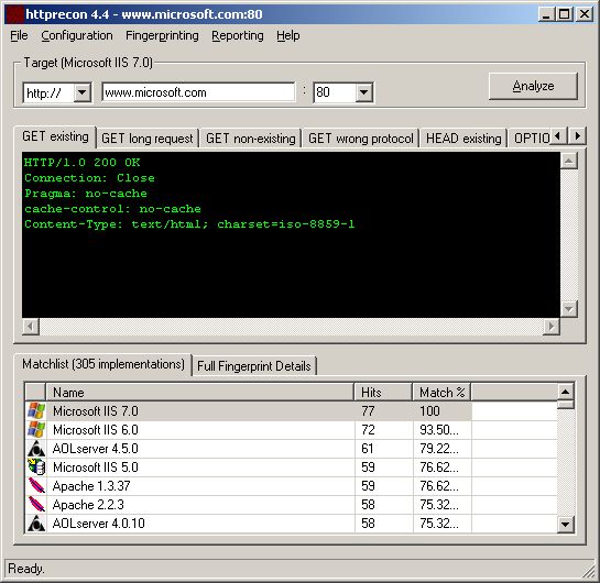 This increases the amount of fingerprints to distinguish the given implementation. Thus, the accuracy of the fingerprinting series is very high. Theoretically httprecon 1.x is able to generate approx. 198 fingerprint atoms per full scan run (usually between 80 and 120 are given). More details and a documentation is available on the project web site.