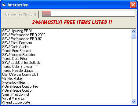 This is an application I put together that goes on the web and downloads and lists the links to thousands of vb related software and more. Not all the items are free but enouph are that you ll be busy "unwrapping" your new christmas presents for weeks to come!!