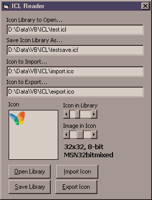 Additionally this code also allows for the importing of icon files, and exporting of icons files, displays the count of the icons in the ICL, and the count of the images in each Icon. It returns the color depth in bits per pixel, width, and height of each Icon Image, and the name of the icon within the ICL. Thanks to the code from vbAccelerator, any particular Icon Image can be returned in a PictureBox.