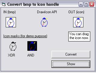 I needed to convert a bitmap to an icon without having to save it to a file. Just getting a handle to the icon was sufficient, and fncMakeIcon does it. A second function fncConvertIconToPic converts an icon handle to an (almost) picture. I used it to check the good working of fncMakeIcon. And once it is in a picture box it can be easily saved to a file of course. (ZIP 5K). NEW UPLOAD