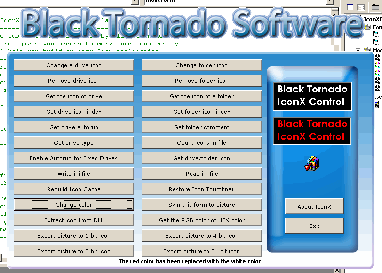 This hot code provides many powerfull functions for you READY-TO-USE, wich include (Change Folder Icon, Change Drive Icon, Rebuild Icon Cache, Export Picture To Icon (USING-API), Extract Icon from DLL, Count icons in file,Get a Drive of Folder Icon, Thumbnails for BMP files, Fix Explorer Icons, Skin form to Picture, Replace Color with another, Fix Icon Thumbnails, Read Ini file, Write Ini file, Get the RGB color of HEX color and many more...