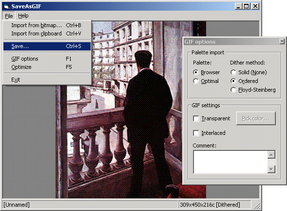 First: All thanks to Ron van Tilburg for the amazing VB GIF encoder (original post: CodeId=14210. For GIF decoding, check Vlad Vissoultchev's work: CodeId=44216). This simple application lets you import (dither) to 8-bpp bitmaps and save as GIF format. Transparency and trailing comment now supported. About palette imports: only Halftone-216 and optimal palette are allowed, anyway, you could easily add custom palette import.