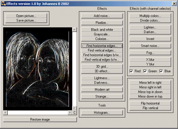 How about 30 image effects and a histogram function using Getpixel, Setpixel and BitBlt API. I know im not the first one to submit effects/filters.. but this one is very easy to understand. It is not as fast as some others but it can easily be modified. Effect list: Add noise, Pixelize, Black And White, Grayscale, Colorize, Find edges (horizontal and vertical), Find Edges b/w (horizontal and vertical), 3D Grid, 3D Effect, Lightness, Darkness, Modern Art, Strange, Multiply colors, Divide colors, Lighten, Darken, Invert, Smart Noise, Fog, Blur (horizontal and vertical) and some mirror/flip effects. You can also save your processed images.
