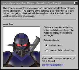 This code demonstrates how to create image selection rectangles more commonly known as 'Rubber Band Lines'. These will prove useful to those of you who are writing an application which requires the visible display of a selected area in an image. Votes and comments always welcome.