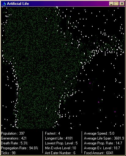 This program demonstrats evolution of a 'species'. To clarify, I am not saying evolution is the correct solution, just that this program is based on the theory. The green dots are basic food. The white dots are the basic organisim (ants). The purple dots are ant eaters. The ants can turn to ant eaters and back again depening on the circumstances.