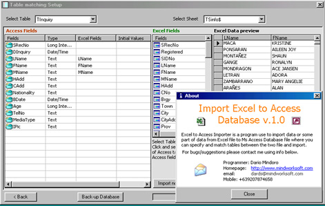 This program can able to import data from Excel Document to Ms Access Database file, the user will just select fields from the table on Access Database, and also select fields from the sheet of Excel file, the user can just drag and drop excel field to the matched field on Access database table, backing up of Access database is included in the program for data safety in case of user error. I created this program because I cannot find any program like this anyware, it took me half a day to finish this program since its a rush and that our client needs to import thier existing data from excel to the Inventory System database. If you find this program useful please vote for me, also visit my homepage www.mindworksoft.com for more free programs.