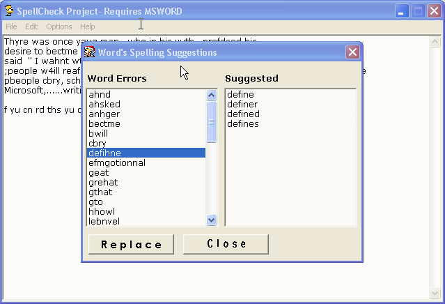Its ok to have your own spell check but Who wants to install a 5 MB Dictionary File with their application. The best solution is to borrow a DLL from MS WORD, is this not a simple solution. This code now imports Dictionary of the MsWord to its own application. It verifies the grammatical errors and suggests the correct word replacement. Have a look at screenshot. This is really a nice example. It also had a very good Find and Replace Example. Try it and you will know.