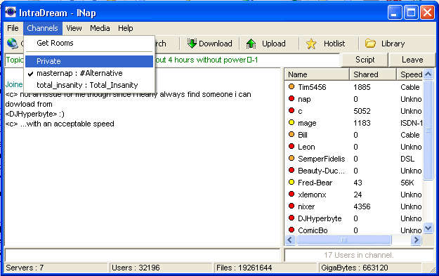 A Napster Client based on opennap/slavanap protocol specs. it supports chat/pm/all forms of transfers/easy server connection/script support in chat/private message/hotlist/browse files/ and basic media player ability. a install and more screenshots available at https://www.intradream.com/inap/index.html . it dosnt have the file base some of the newer p2p apps have but it certinly isnt dead tons of people still use audioGnome and there still is a bunch of servers to connect to. i recomend using it for chating. Thats the best part of napster in my opinion.