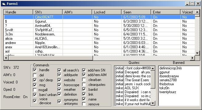 It's a nice simple but very effective bot. It has some brand new features never before seen on aol. It features a multi user bot system in which the user will be prompted when he enters the room to type ".handle "your handle", and that's when the fun begins. You can store your contact info on it like your website or AOL screen names and AIM screen names. You can also to many things like look up definitions to words,look up antonyms and synonyms, look up what the weather is like for a zip code, look up the meaning of your name, find out what your daily horoscope is, and much more.