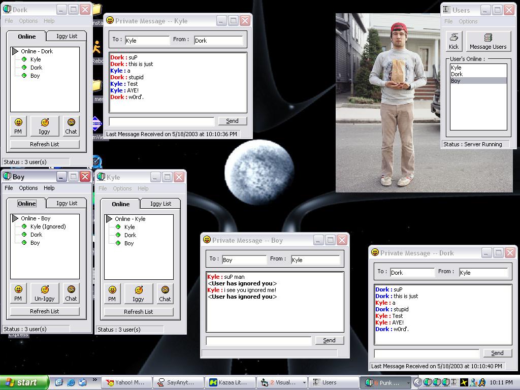 A basic instant messenger, used for private messaging. It can up to 30 user's, or more. Of course would have to edit coding, the coding is about as easy as your grandma on a tuesday :).Good for beginner's to learn, multiple winsock connections. Host runs the server, and walla walla bing bang!. Check out the screen shot, and check it out. I think it's the best by far on VBCode. The Richtextbox color's, splitting data, ignore function, chat, private messaging, the works. Vote for me.
