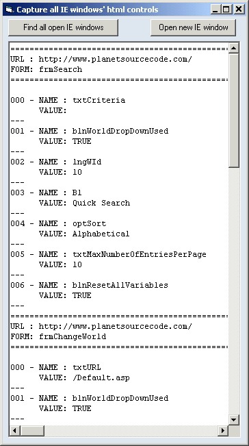 Read and edit the names and values of all the html controls (textboxes, buttons, lists, checkboxes) in all currently open Internet Explorer windows. Hope you find it useful.