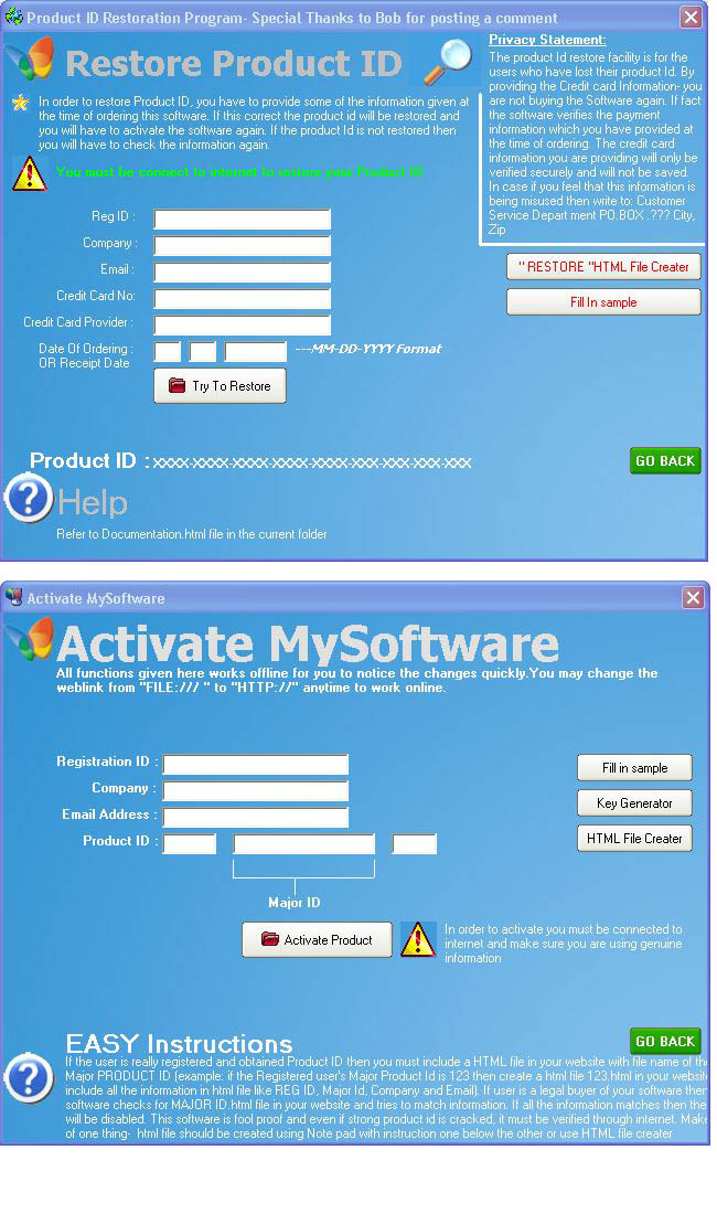 READ THIS:This is an updated version of INTERNET PRODUCT ACTIVATION with Product ID RESTORATION facility from internet. If the user has lost his product id then he can restore it securely from the internet. The Visual Stlyes and the Interface has a lot of improvment.This code comes with complete DOCUMENTATION and also adds a lots of NEW FEATURES. The RESTORATION facility is an advanced version of this code where user can LEGALLY restore his PRODUCT ID after which user must REACTIVATE the software using Activation Program. The trial has expired and the only way to continue using the software is to ACTIVATE the product through INTERNET using a unique and STRONG PRODUCT ID. If the user is really a legal buyer of your software then this software checks for the payment information in the INTERNET DATABASE while ACTIVATING. If the information is matched then the product wll be activated. Even if the PRODUCT ID is cracked by some means- it must be verified through internet and if the payment information is not found or invalid then this software will not be activated. Believe me this is the best way to secure your software and there is no room for any cracking. All the operation are taking place online using SECURE TRANSFER and this software tries to match the information you have typed with the information you have provided at the time of payment. This software also uses a advanced PRODUCT KEY GENERATOR and HTML File Generator. Also highly secure TRIAL FUNCTION is used where only some executions are provided to use the software. Activation also works offline. And THATS NOT ALL- the software user very Easily understandable code with state of the art security like Microsoft windows Activation. If registration taking place offline means it is not secure. Only online transactions are secure. With cool visual styles and Windows Xp looks- this ones really for you. Dont forget to VOTE FOR ME. And hey! dont forget to vote for me.- °Sri Harish°÷°