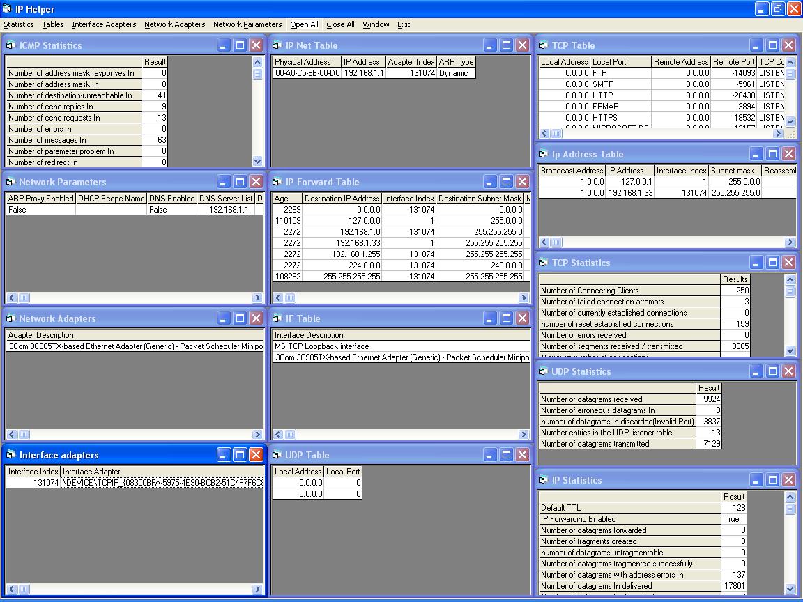 Gets all IP iformation, add delete ip forward routes, Release and renew DHCP IP address on an adapter, Kill currently connected sockets.