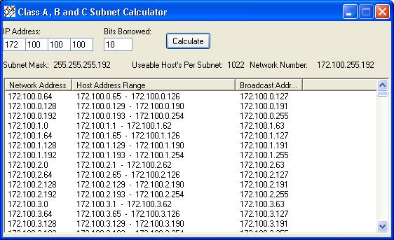 This is an update to my previous code submission. This one will calculate Class A, B and C addresses. I would like to thank flipmode for informing me that it is the last ip and not the first that is the network number. It takes a while to calculate Class A addresses since they are so large. So if you are calculating a Class A and it stops responding just let it go for a while and it will probably catch up. I also ran out of memory trying to calculate a Class A address so you might want to watch out there to. I appreciate comments so I can improve my work. Thank's
