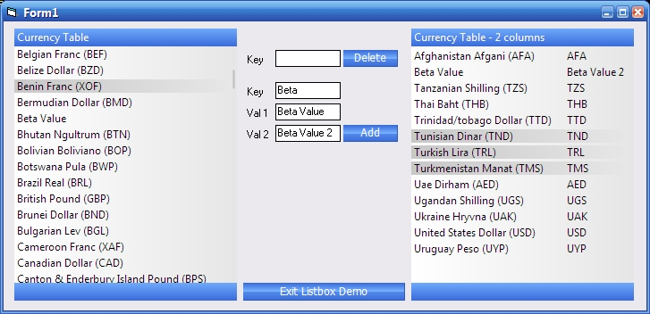 iPhone style low friction smooth scrolling listbox. click drag, let go and the list smooth scrolls to a stop. allows 2 values to be stored against a key and either 1 or both to be displayed. long text is shortened to correct lengths with a '...' suffix. context bar on the right lets you know where you are in the list. there is a custom data class behind the scenes and the user control maintains a linked list on the data to provide quick sorting, regardless of physical data order. arrow up/down or mousedown on header/footer for fast scroll.