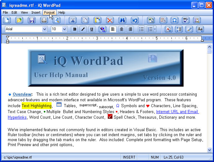 Update 4.0 - Rich text editor designed to give users a complete but simple to use Word Processor containing advanced features and modern interface not found in MS WordPad. Features include text highlighting, tables, line spacing, Internet and Email hyperlink, superscript, subscript, symbols, headers, footers, word count, spell check, and several more. Includes feature's not commonly found in editors created in Visual Basic. This includes an active Ruler toolbar (inches or centimeters) where you can set indent margins, set tabs by clicking on the ruler and move tabs by dragging tab marks on the ruler bar. Also, print formatting with Page Setup, Print Preview and other options. Be sure to view the iqreadme.rtf document for details of the project and samples of the features. Complete Help Manual available from the Help Menu. (Update: Ver.4.0 - Added Recent Fonts menu, fixed table width bug and more. View IQREADME.RTF for update details and history.)
