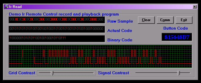 This version only works reliably with olderstyle Panosonic or REC-80 remotes, and a PC with pentium 200 Mhz or better. VB does not interface well with the hardware directly. I will admit that VC will do a better job at what I am doing with VB. I have used the Receive line as it is more stable and I have figured out how to read the signals. I began with using a 850 MHz Celeron machine, it captured the IR signal well on the DCD line, however slower machines did not fair so well.