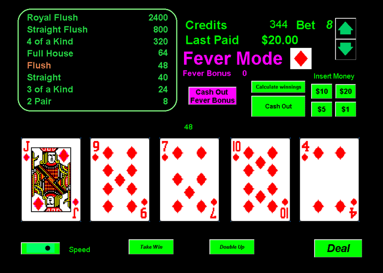 Complete game of Jacks or Better Video Poker. This is one out of the five games my shareware video poker contains. Game is Full screen. Use of an .ini file for the saving of the hi-score sheet. Sound, help file, etc. enjoy, and let me know what you think.