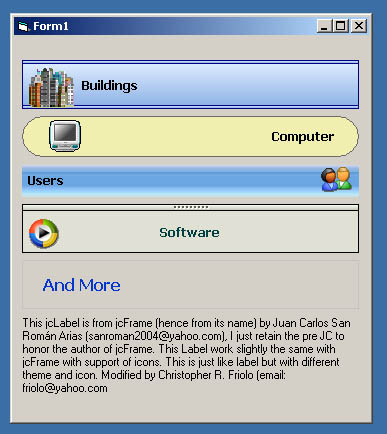 jcLabel is a label with Style, theme color and icon project modified from jcFrame (hence the name) authored by Juan Carlos San Roman Carias here in VBC. I think about a simple one the frame to make it label that i going to use im my program. Big thnx to Carlos, hope you like it. If any errors kindly inform me since i did not start this there may be variables which are not neccesary any more.