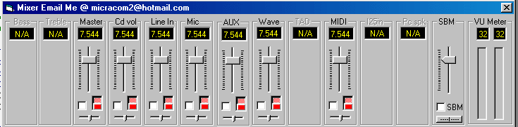 Update to my mixer, now detects audio card devices and displays volumes for all available devices. Better code than last version. Control master, CD, Line, Aux, TAB, Mic Treble, Bass and more. This is all API and can be a little confusing to newbie’s. Open the systems sound mixer and use this app it will move the mixers vol’s as well as this apps.