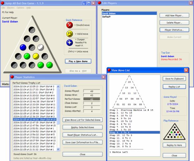 A great traditional game that is easy to learn but difficult to master. This game provides all the ingredients of strategy visualization, hand-eye coordination, and pattern-recognition, which are techniques that have been proven in clinical studies to promote increased IQ ratings. So, you are not just playing a game; you are making yourself smarter! Additional features are UNDO, HINTS, auto-finish games (when there is a solution and you are stuck -- or just plain want to cheat and learn a set of moves). Unlike the urban legend that there are only a few solutions to this game, a quick test revealed that there are about 2000 solutions (if not more) starting from ANY location on the board (that's about 30000 total -- I used to think for years there was maybe 2 or 3). Prove it to yourself by selecting the same starting point, and let the game auto-finish for you (select the FINISH THE GAME FOR ME, PLEASE option from the Help menu). Chances are good it will successfully solve the same game differently each time. A TRAINING WHEELS MODE has been added to walk beginners through a game. It highlights marbles with a cyan circle that will lead to victory when you move your mouse over them. Fun to watch all the possible variations in a single game. Added another cheater option that disables the HINT button when it is not possible to complete a game in victory. This helps beginners tell immediately when they took a step that will lead to defeat. Added more help and escapable demos and replays (use the ESC key). Also includes are over 22,000 sample solutions that end in a perfect 1-marble victory, and 51 others in a sample JoeCheater.player save file.
