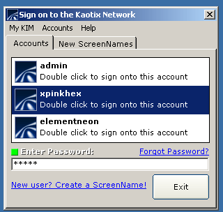 Version 1.0.2 of my instant messenger is basically just another update to the sign on dialog. I added a few features like "change account icon" and I also changed the way it works -- now all you have to do is enter the password and double click the account name. By the way, the password for all three preloaded accounts is admin. Anyway, next I'll be working on the server a little more and then maybe some other stuff like the chat window. I'm gonna add MD5 encryption because hey, if its good enough for AIM and MSN Messenger, its good enough for KIM lol