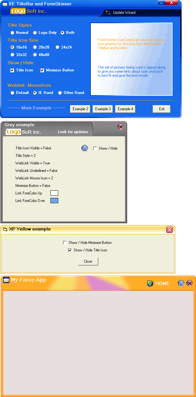 FormSkinner UserControl lets you create and load-in your own graphics to skin your form with custom Titlebar and borders. There are surtain rules for the graphics, but you'll get a good idea if you check the included pics. (I know this will increase the size of the download, but it's helpful. At least for beginners. In that matter... use "folder names" when extracting) You can also put your Company Logo up along with the caption and icon. Link to web is also included... Added for the "Online Update" purpose. There is more useful properties that can make your form(s) innovative. Thanks!