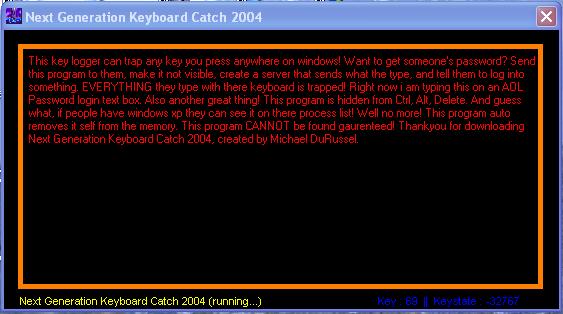Next Generation Keyboard Catch 2004 will trap almost every key on the keyboard and put it into a label. The program is removed from memory and is not on the process's list and is also not on the Ctrl, Alt, Del list. Take a look at the screen shot! The keylogger can catch anything pressed on the keyboard no madder where it is. If you set the form's visible property to false, you can type stuff in other applications and it will appear on the keylogger! Typing passwords in a program? The keyloggers got it!