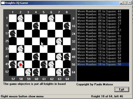 This game test your mind. In a board with 8x8 squares, you need fill all squares with knights(Rule of knight is same of a chess game).